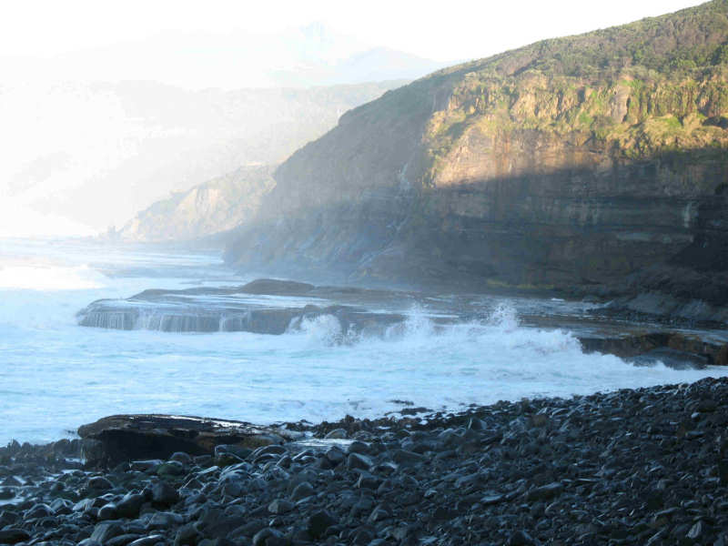 On arriving at the coast just after 7.00 am we passed close to a small campsite that was occupied by a tent. We were disappointed to see the campers had lit an illegal fire close to the tent on the peat soil, despite the presence of 'No Fires' signage at the registration shelter at the start of the walk.  The fire didn't appear to be alight, but we could still smell smouldering coming from somewhere.