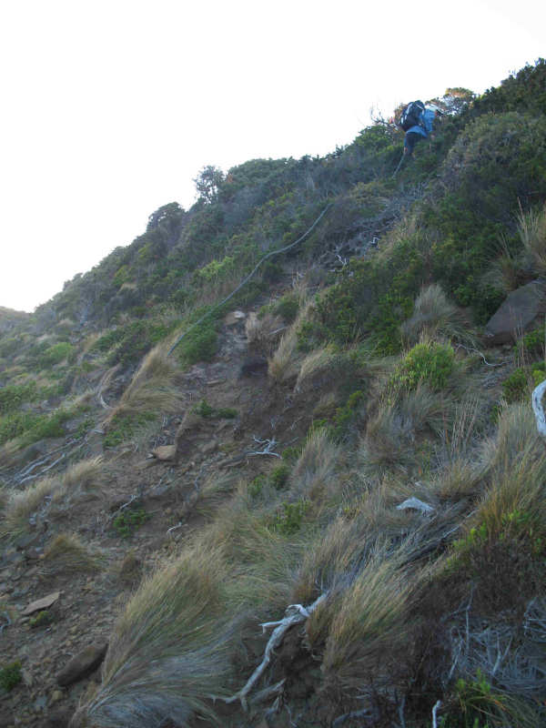 After about 30 minutes we came to the creek gully and were happy to see a rock cairn marking the route up from the shore. We were, however, disgusted at the amount of plastic garbage that had been washed up onto the shore from, one can only assume, the many fishing boats that cross South Cape Bay. I'm afraid I don't believe the excuse that the stuff gets accidentally washed over the side of fishing boats. There is simply too much rubbish for that to be believable. This is a problem that occurs along the entire south and west coasts of Tasmania - as Matthew has experienced on his three circumnavigations of Tasmania, and others, by sea kayak (see his trip reports at mwatton.blogspot.com.au ).