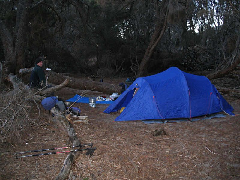 Arriving at Hazards Beach campsite at about 4pm, we set up the tent in a perfect setting, close to the beach, a level site with a sandy base and cooked an easy curry meal with a hot chocolate drink.