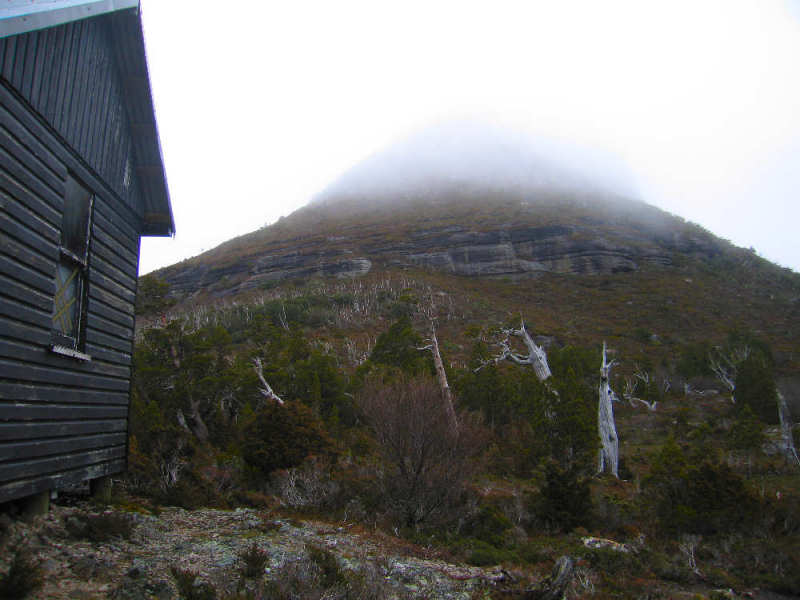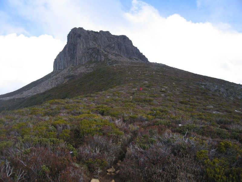 We had previously decided that, if the view of Barn Bluff was reasonable, we would leave our main packs and take light packs to the top. As it was clear on Barn Bluff we headed off along the side track, with me becoming a bit anxious as I saw the steep climb that was confronting us. It looked awesome with its huge bulk directly in front of us.