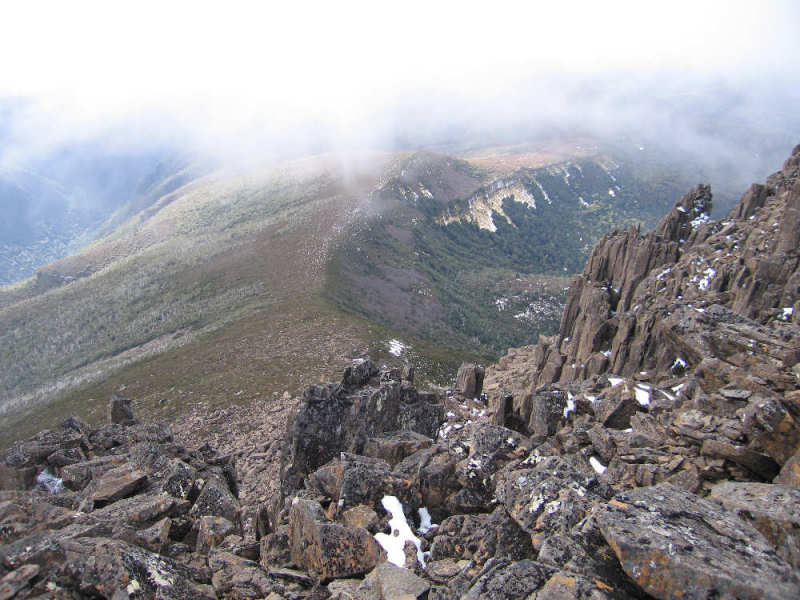 We continued down very carefully, especially over the sloping snow bank and part of the way down we met Brendan Maggs coming up, carrying his large pack. He told us he intended to camp on top of Mt Ossa and had already climbed Mt Pelion East on the way from New Pelion Hut. As we left him we wondered what would happen to him if it snowed (covering tracks) or froze over even more overnight.