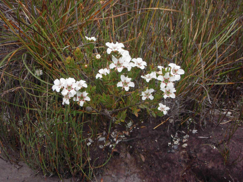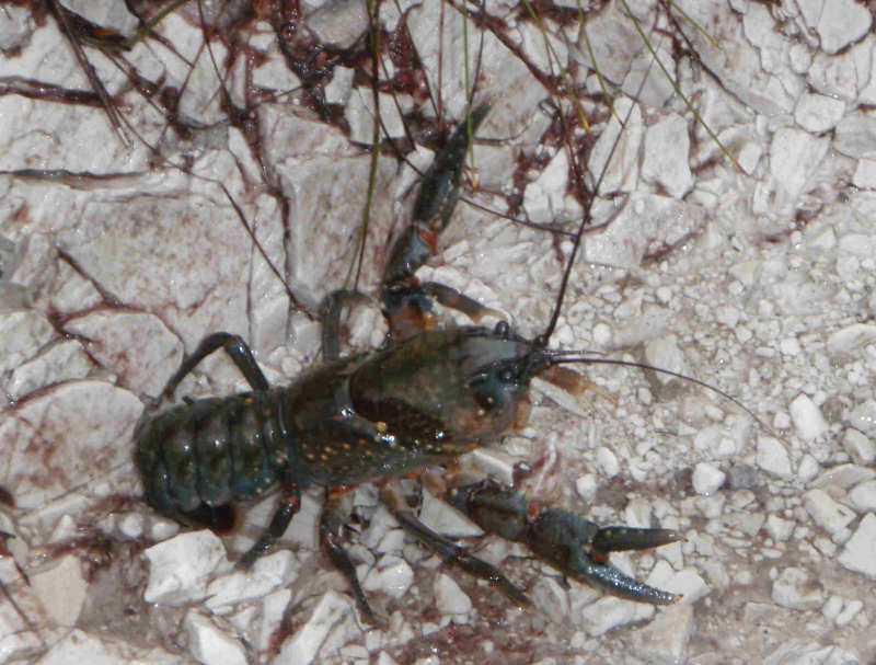 At one point along the quartzite track we saw a rather startled freshwater crayfish. It stayed in its position of claws raised in a threatening pose long enough for us to get some good photos of it. It was about 150mm across the claws and about the same length overall. [I found out later that this was a member of the giant freshwater crayfish family - Astacopsis tricornis and did not live in a burrow, but rather in freshwater streams. It might eventually grow to a size of about 2kg.] Totally protected, of course.