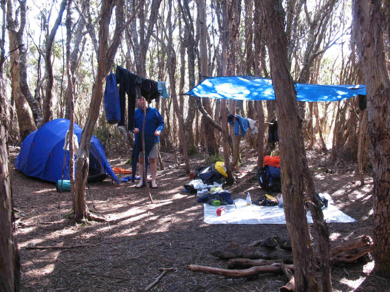As we clambered up along the track I said to Matthew, "I wonder what Bear Grylls would have done!" Whatever it was, he would have made it more spectacular than it needed to be. Just then on the left I spotted our intended campsite but to my surprise the small site was already occupied by a rather large dome tent. On asking if there was anybody home we established that there was a male/female couple from Victoria who had walked in from Birch's Inlet, across the Lost World Plateau and up the Port Davey Track to this camp. Apparently, they had been walking for 24 days and we were the first people they had made contact with in that time.