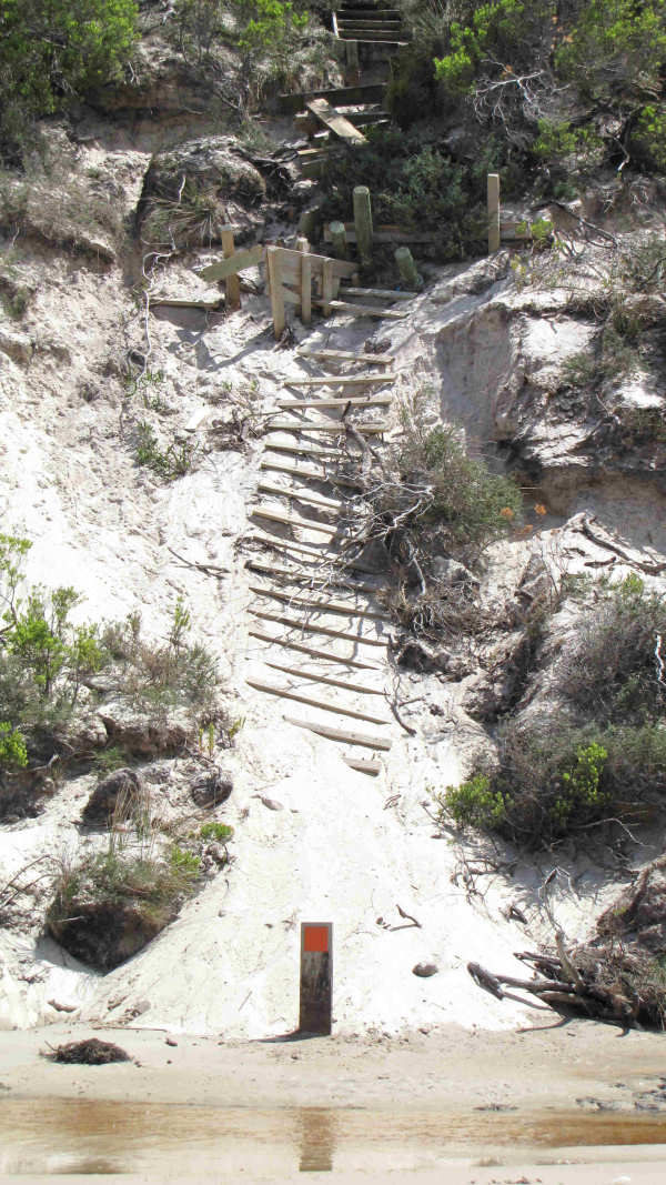 At the end of Prion Beach there is a steep set of steps, some of which have been destroyed about 3m from ground level. This made for an interesting and difficult haul of packs across the missing section and very likely would have been difficult for lone walkers. Fortunately, with two of us we were able to manage without too much of a drama. As mentioned earlier, on the way west, there is another set of steps near Milford Creek, some of which have been destroyed about half way down a steep, 30m sandy slope. Consequently, we were forced to step down the side, pushing the soft sand in front of us as we went. We did not feel good about damaging a dune area like this but there really was no alternative.