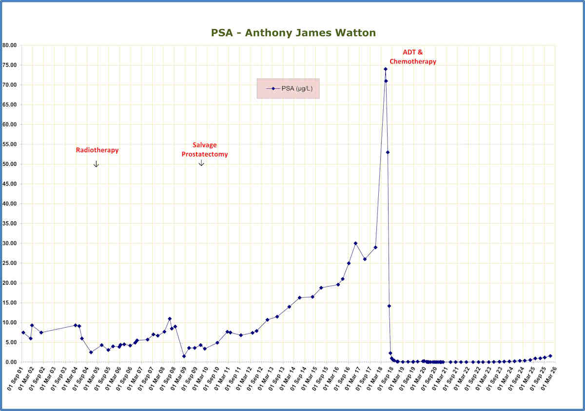 As can be seen in the chart at the start, my PSA has risen, marginally, to 0.04. The medical oncologist considered that this could be explained by the traumas that my bladder area had experienced over the past two months. It will be interesting to see the result at the next blood tests in three months time.