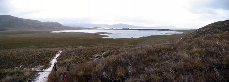 It was a fairly dreary walk along slushy tracks until we reached the South Coast Track junction after about two hours. The boards here made travelling a lot easier. We had considered trying to go across the New Harbour Range but missed the turn-off after leaving the campsite. It was probably a good "decision".