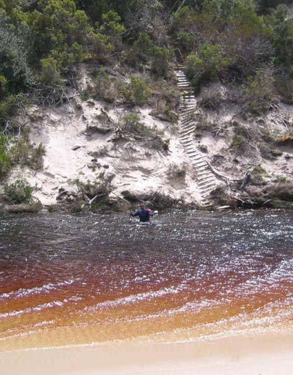 At one point the boards formed a bridge about four metres long that crossed a deep v-shaped creek about three metres down. Fortunately, the wind allowed us to cross unhindered.