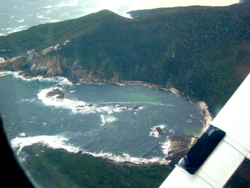 It was a fairly overcast flight to Melaleuca, with low cloud and a westerly wind. The pilot chose to travel via the coast with a maximum height of 2,500ft. At Southport he asked us if we wanted to keep going as the visibility was getting worse. We said if he thought it was safe to go on we wanted to, so he pressed on. There was no real view of Precipitous Bluff but Matthew pointed out some of the other features, including bays and beaches he had encountered on previous kayaking trips along the South Coast.