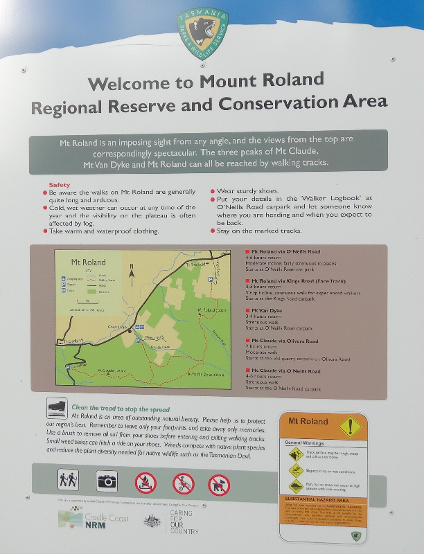 I had climbed Mt Roland about 10 years before, from the Gowrie Park (southern) end and had found a gradual but rather long walk with no particularly difficult sections that had caused me any concern. As I was by myself at that time on the way back down I started but did not complete the climb of Mt Van Dyke as the wet, large rounded boulders near the summit dissuaded me from taking any unnecessary risks. So, neither Matthew nor I had previously used the Face Track, from Kings Road, and we were keen to tackle what seemed to be a very imposing range with steep approaches. We had with us some track notes from "100 Walks in Tasmania" by Tyrone Thomas and I had checked out the Bushwalk Australia forum for any relevant comments about this walk. Matthew had with him his phone with map software and GPS. I took the GPS-enabled personal locator beacon - as I did on all our adventures and a few other essential items, including Gatorade drinks.