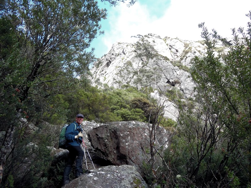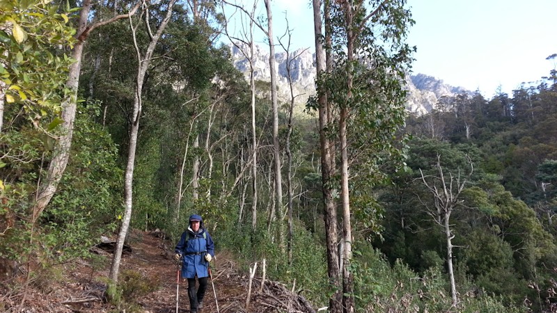 When the trekking poles we had with us became more of a hindrance than a help we left them on the track and continued on up without them. This made climbing a bit easier as we could grasp branches and rocks more easily with both hands free.