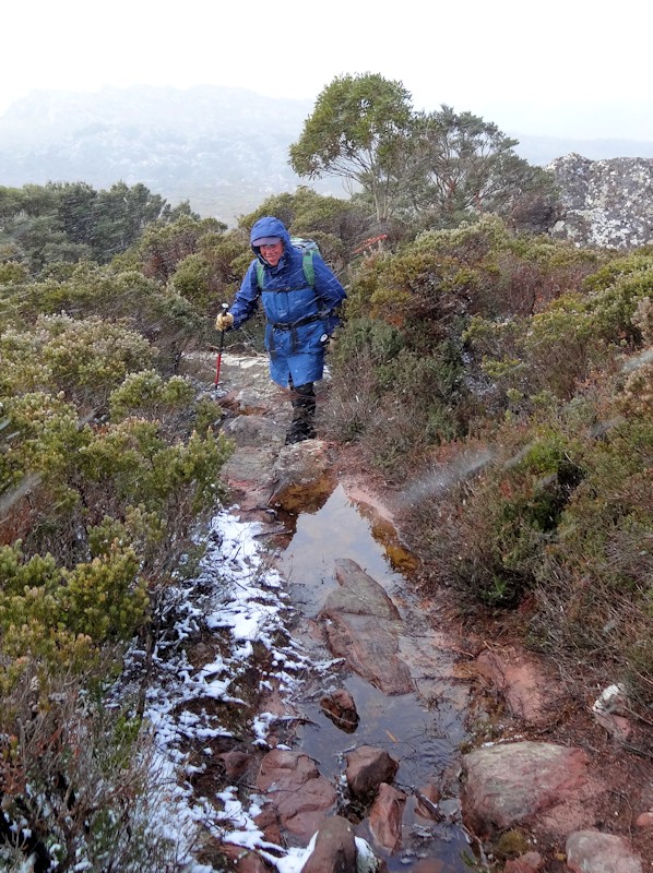 As we struggled up the slope, we were passed by a very fit looking 40-something male in running gear who, it turned out, lived near the mountain and had made over 1,000 trips up Mt Roland, timing himself as he did. [When we later encountered some muddy parts of the track Matthew remarked that he had not seen any evidence of the runner having gone that way, but I suppose he did not always go right to the summit.] I needed to take a few rest stops to get my breath back and have a drink of Gatorade before plodding on uphill. As the incline became increasing steep we needed to scramble up near vertical sections of rock and I wondered if it would be easy to get back down one pinch in particular. By this time my fingers were very cold. At the start of our walk, realising that there would be quite a lot of rock scrambling, I had worn riggers' gloves and they soon became sodden and cold. Therefore, my fingers also became cold. When I mentioned this to Matthew he kindly lent me his spare woollen mittens. These were very difficult to pull on over cold, wet hands but my fingers soon thawed out and the circulation returned. The downside to mittens was that I could not easily grasp hand-holds to assist in climbing so I reluctantly took them off and put on the riggers' gloves again. My fingers were OK by this time and I felt more comfortable climbing.