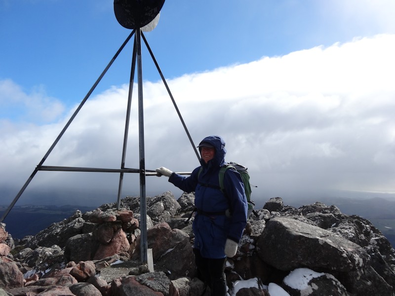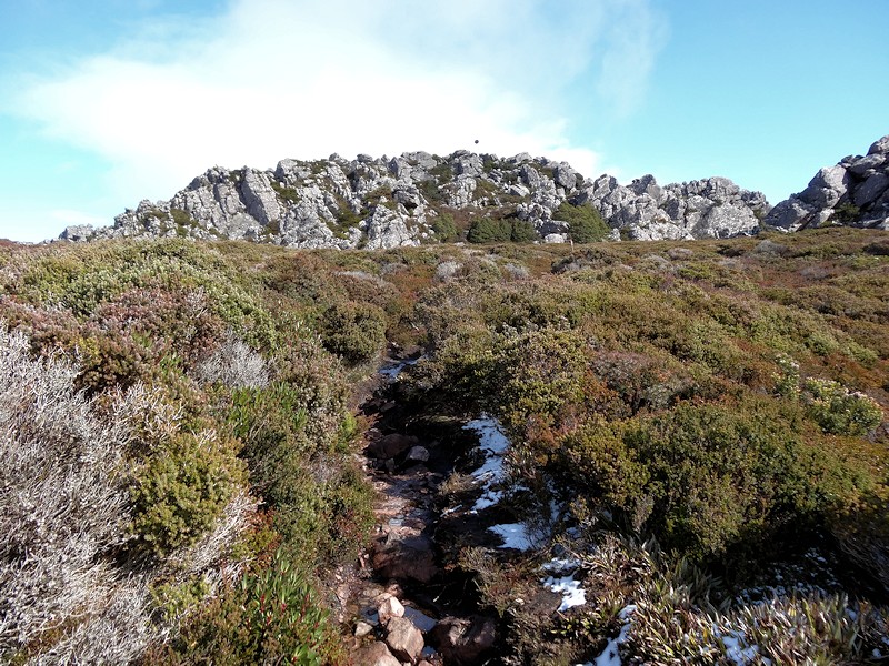 We turned south at the top of the gully and began the more gentle ascent across the plateau towards the actual summit of Mt Roland. Although the notes mentioned a distance of 1.3kms it seemed to me at least that it was a lot further than that. Maybe the distance referred to in the notes was a direct line, whereas we walked quite a roundabout route. It was quite a relief to reach the summit trig point. On this walk I failed to take sandwiches - I had brought them on some of our earlier walks - and I realised it was a mistake. Not that we would have eaten them on the summit because the cold wind was howling up at us and it was very unpleasant on top. I think we stayed there for only about two or three minutes, took a couple of photos and hurriedly started back down.