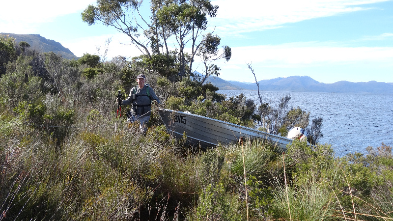 After changing into our walking gear and stowing our boots, gaiters, poles and packs we set off on the 30-minute trip to Mt Solitary. There was a stiff breeze that we were heading into so we tried to make use of any available shelter (Scotts Peak, for instance). On reaching Mt Solitary we pulled the boat up onto the heath, away from the water's edge and roughly tied a rope to some small, handy shrubs.