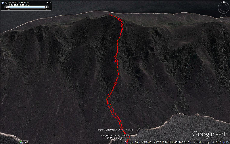 We started back down at 3.15pm and were able to follow a faint pad for some time, that had not been entirely obliterated . Not far from the top I slipped while clambering down a rock face, causing me to incur a nasty whack on my right thigh, just above the knee and a cut to my face at the right corner of my mouth, which did not want to stop bleeding.