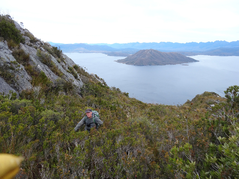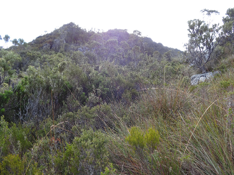 By the time we were ready to start the ascent it was already 11.00am. Notes from the Bushwalk Australia website we had read indicated that previous walkers had taken roughly 2½ to 3 hours to reach the summit and about 2 hours to return to the shoreline. However, these accounts were dated from the 2008/2010 period and we all know how scrub grows in a virtually continually damp environment!! But, they were probably younger, fitter walkers as well.
