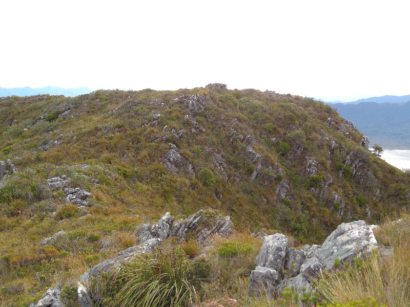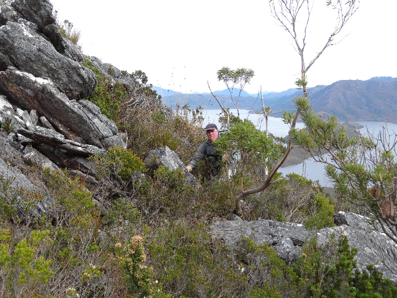 We chose to go up a prominent ridge directly in front of us, that would take us straight to the summit. The initial part of the walk was easy, through knee-high to thigh-high heath and buttongrass but, as the actual climb began we encountered rock outcrops and faces that needed to be either clambered over or around on small ledges. We were also frequently struggling through head-high wiry bauera and unforgiving banksia marginata shrubs. Matthew once said he detected the smell of burning. As he had just dislodged a large lump of rock that bounced off other rocks, we concluded the smell was from rocks striking each other, as in a flint igniter. We thought it would be unlikely we could start a bushfire, given the amount of wet vegetation, but it could just be possible in very hot, dry conditions.
