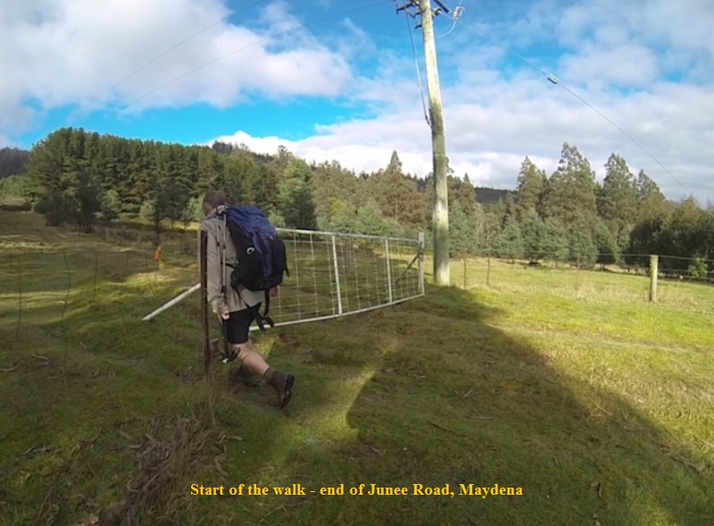 The drive out to Maydena was uneventful, with very little traffic, travelling as we were in the middle of Winter and on a Sunday morning. We arrived at our start-point, where Matthew parked his car near a large steel shed a short distance up Junee Road, at 10.00am. We prepared to start our walk, from an elevation of approximately 300m.