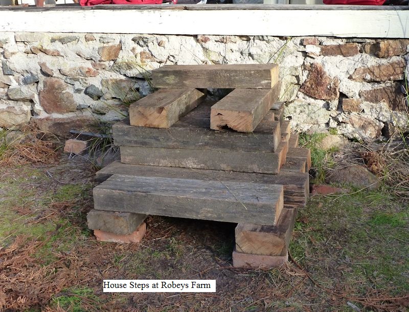 During our previous visit to Robeys Farm in 2011 (Second Visit to Maria Island) we were concerned that there was no access to the front verandah of the house. In order to get up onto the verandah it was necessary to grab hold of the upright support posts that were not securely fixed in place. Therefore, to make access a bit safer and to protect the structure to some extent, Matthew and I fetched 16 heavy slabs of the ex-bridge structure from the creek, about 250m away, one at a time, and constructed a free-standing set of rough steps up to the verandah. When we arrived at the house this time we noted that our steps had been replaced by a set of wooden steps, similar in style to those that existed in Mr and Mrs Robey's era.