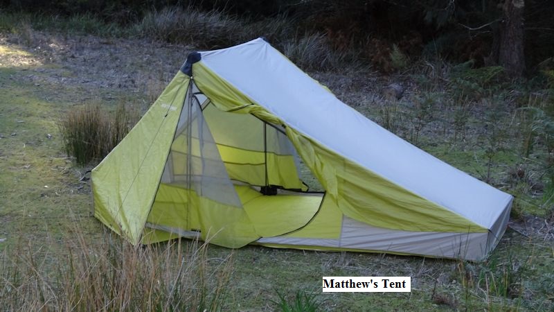 We set up our tents - mine a 1995 Macpac Minaret 2-person tent and Matthew's an ultra-light Sea to Summit Specialist Duo single-skin, 2-person tent weighing under 700gms. It looked very flimsy and this was the first time it had been used on a walking trip.