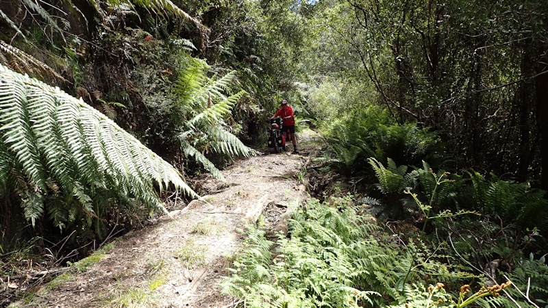 A short, fast descent led us to a right turn into Boney Road, a rough 4WD track, lined with ferns. Quite delightful. The road climbed steeply, with much bike pushing until we reached a more level area. This section consisted of rock slabs alternating with areas of soft sand with some boggy patches. Matthew commented that he would have liked the entire Tasmanian Trail to be just like this. I wasn't so sure, but I understood his need for some technical riding, rather than simply bowling along a made road for kilometre after kilometre.