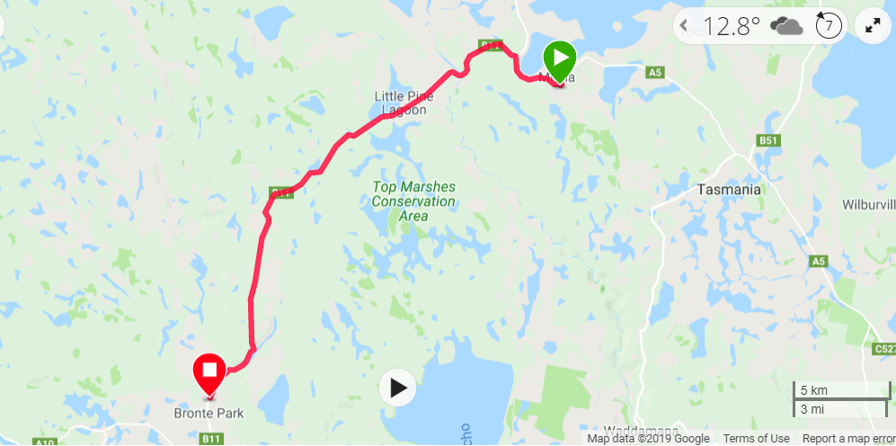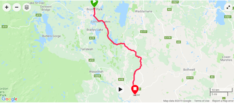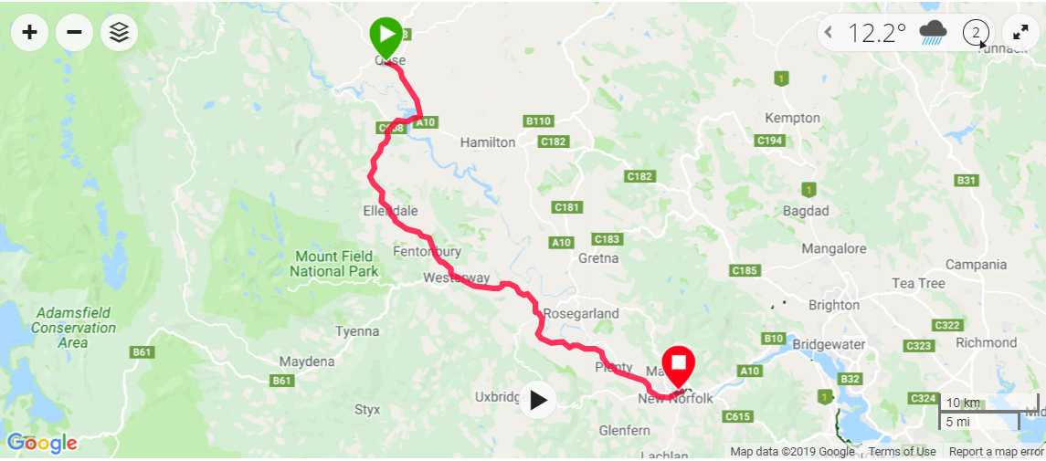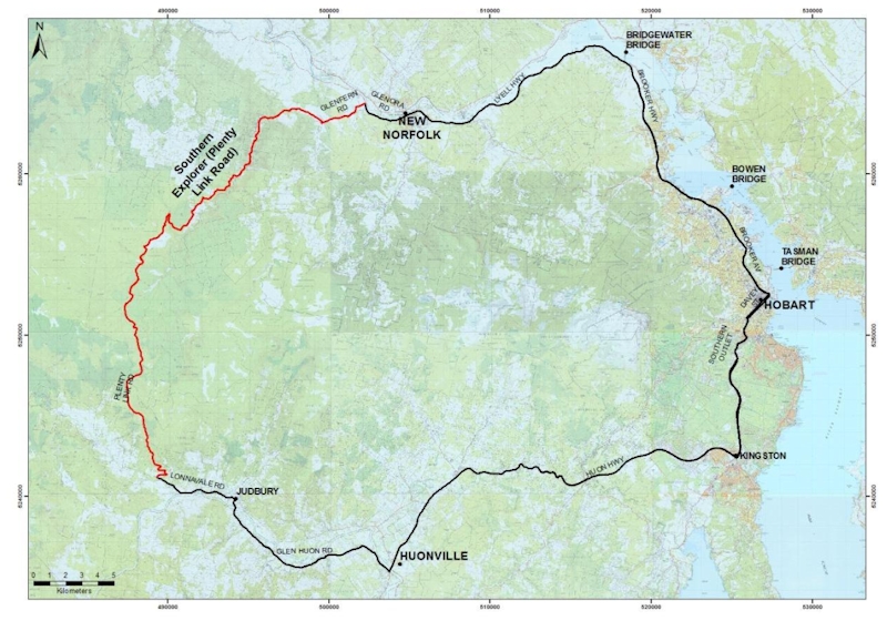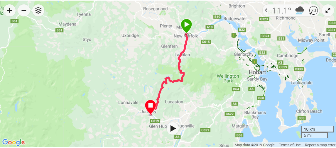 After a 7.00am start, we bought some sandwiches and drinks before driving to Judbury, where we left my car next to the oval. Matthew then drove us back to New Norfolk via the Plenty Link Road, or Southern Explorer. We later discovered that this road was about 34kms shorter than the 84kms route through Kingston and Hobart. The downside was that it is of a much lower standard, being primarily a Forestry access road.