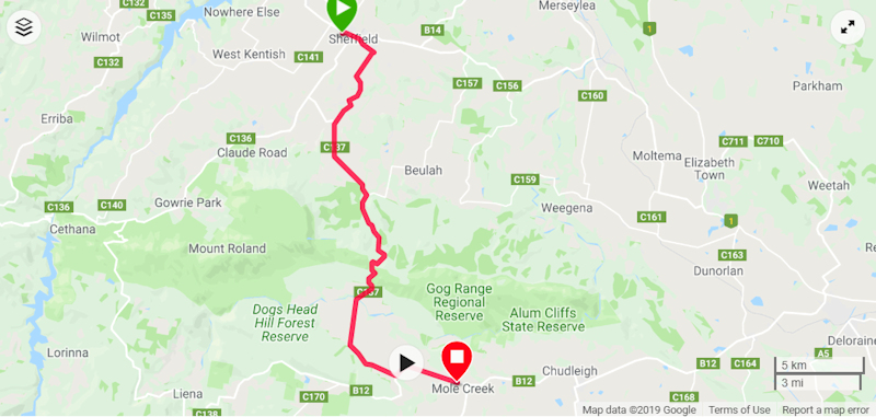 After a very comfortable night and a tea and toast breakfast, we set off at 8.15am, expecting some rain along the 30kms to Mole Creek. This day's ride was along the main road because the alternatives were unavailable as a result of damage to several bridges caused by the June 2016 floods.
