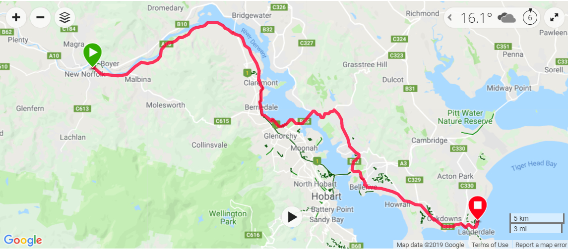 Our ride continued without incident through Lindisfarne, Bellerive, Howrah and Rokeby before we finally arrived at my home just after 2.00pm.