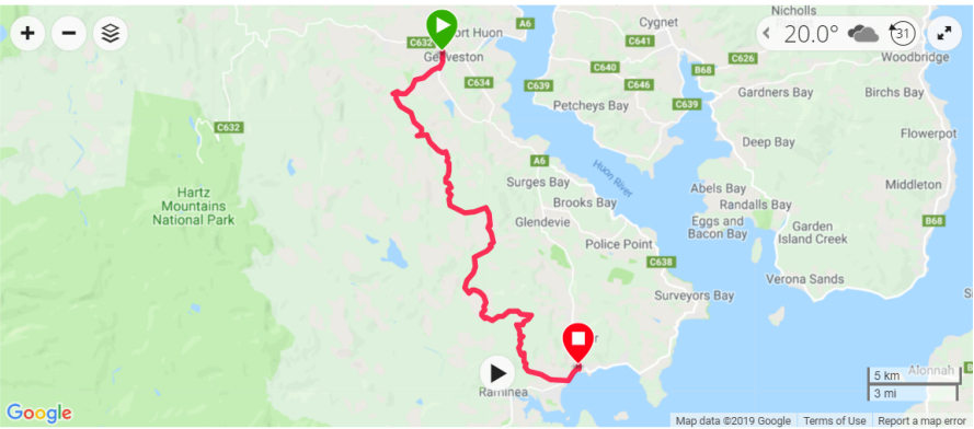 We finished the ride at 1.40pm, feeling very pleased with our efforts for the day. From there we loaded the bikes onto my car, changed out of our riding gear and drove back to Judbury. Back at Matthew's car, we enjoyed a lunch snack while relaxing in the park area near the Huon River. All that remained then was to drive back to our homes.