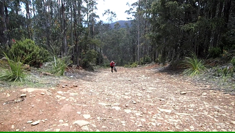 When we then turned south-east on to Haulage Road we started to push our bikes. This continued with some opportunities to actually ride for the next 4kms over a good gravel road until we reached Blue Gum Saddle. At this junction we needed to check carefully the next road to be followed. There was a temptation to continue up Harmons Road, being the main road, but the Tasmanian Trail notes indicated we should: "... turn immediately left and proceed down Harmons Road." So we did.