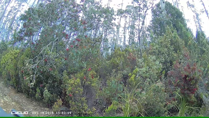 At one of our rest stops Matthew, being in front, saw two feral goats up in the bush but they had gone by the time I tried to see them. Matthew saw another white goat on the track about 200m away. I did see that one. It reinforced our belief that this really was a goat track. [Almost invisible in the centre of this image]:-