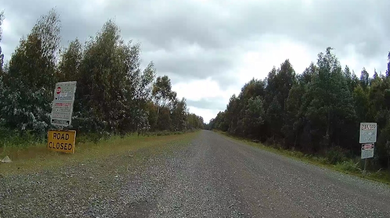 We didn't quite know what to make of this situation but, with nobody in sight to ask, we cautiously continued on our way, with no obvious impediment to our progress. There were sounds of logging machinery away to our right but after about 400m we left the area, with signs giving the same warnings from the other direction.