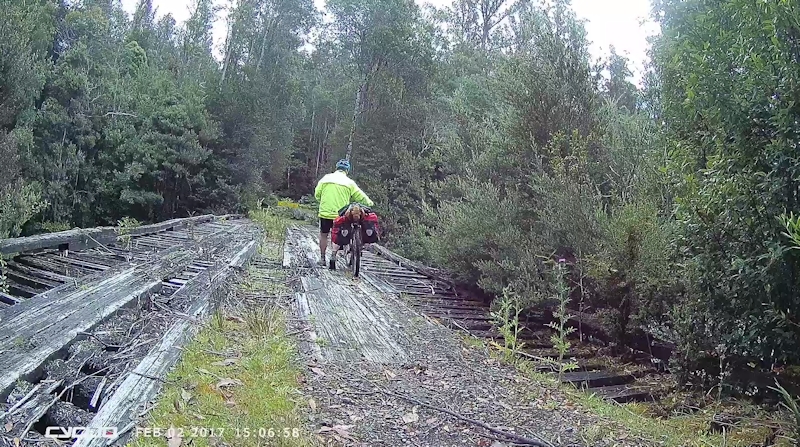 After a very peaceful stay at Corinna we started this day's ride at about 8.35am. As with most rivers we crossed, it was not long before we were walking our bikes up the hill after having left the Pieman River. We soon turned off the road to Savage River and headed across the Savage River bridge.