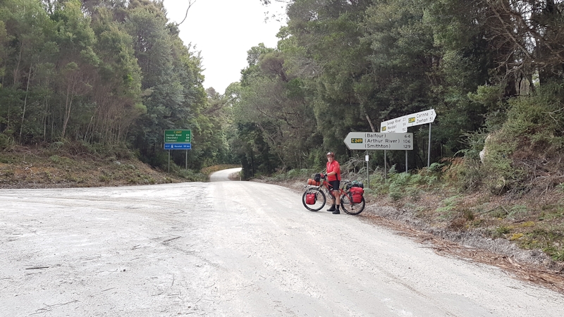 At 36kms from Zeehan we turned left off the bitumen road towards Corinna. The road surface was very smooth gravel, good to ride on but there were many short, steep uphill sections to negotiate, with some good, fast down runs in between.