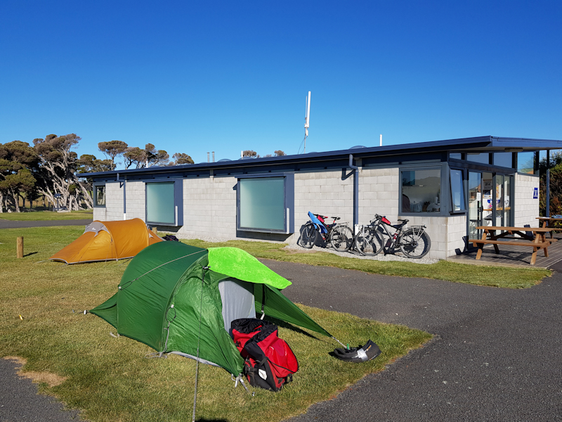 When we reached the Detention River shop we stopped for a drink and a toasted sandwich for breakfast. The ride continued with annoyingly strong cross winds until we finally reached the turnoff to Wynyard and, eventually, the caravan park near the coast. We considered paying for a cabin but, at $120 for the night, we opted for tent spaces in a sheltered, grassy area near the toilet/shower block at $35. Thank you Matthew.