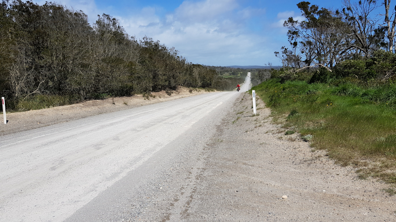 When we reached the gravel road we were still able to maintain a reasonable speed. At one point along this section I swerved across a mound of soft gravel on the left side of the road. As I attempted to get back onto the hard surface the bike's front wheel dug in and I fell, with the bike on top of me, at zero speed onto my right knee. There were a few cuts and grazes, nothing serious, but I was concerned that I might have re-injured my patella that had been broken in a March 2018 fall on a rock track near Lauderdale.
