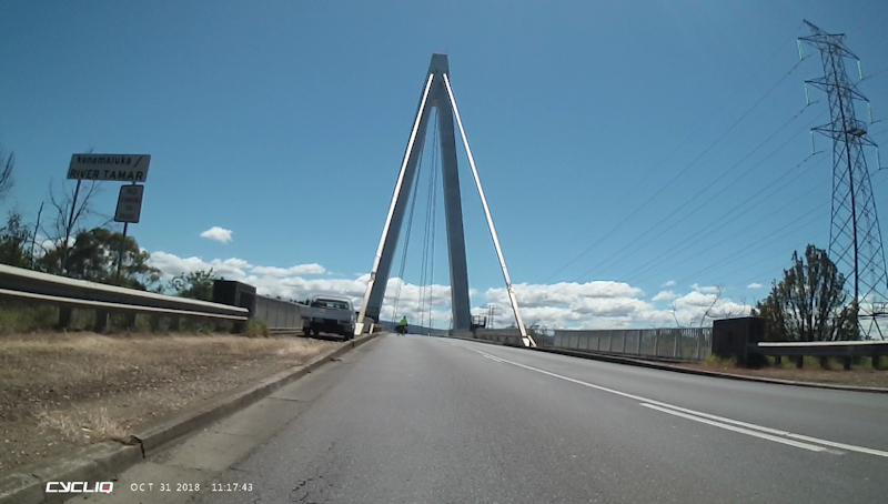 We stopped on the Batman Bridge while Matthew took some photos. This obviously did not please one truck driver who threw up his hands in exasperation as he passed. We had moved our bikes well over to the side so he had plenty of room, with no oncoming traffic from the other direction at that time.