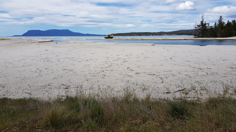 Despite quite a few hilly sections the wind was kind to us and we made good progress through Triabunna. As we approached Orford Matthew stopped to take photos at Raspins Beach and the dredging work that was being undertaken.