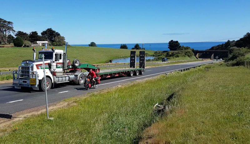 We were fortunate to have a bike track for the first few kilometres but we inevitably needed to join the Bass Highway on the hard shoulder, with much traffic passing us closely at speeds up to 110kms/hr.