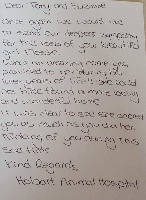 After making an appointment with the vet for that afternoon, we took Flossi in to Hobart to be euthenased. It was heart-wrenching.