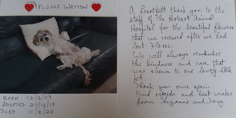 We were so touched by this gesture that I prepared a thank you card with a photo of Flossi, that we delivered to the vet staff on Saturday.
