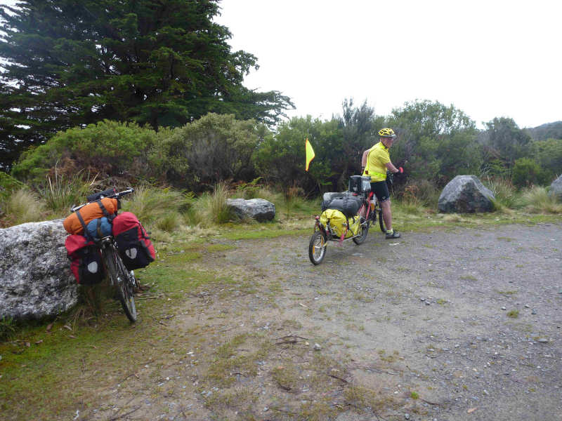 I was riding a Giant XTC2 mountain bike with a low range gear set - in fact the smallest chainring was smaller than the largest sprocket so that in the lowest gear my cadence was faster than the wheels were rotating! I was pulling a BoB Ibex gear trailer and had a front and a rear pack with my tent (also a 2-person Macpac Minaret) and sleeping bag in dry bags, strapped on top of the gear bag.