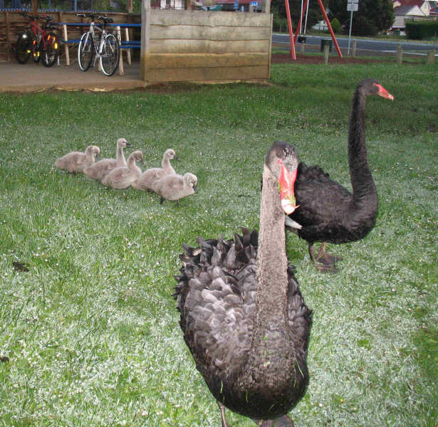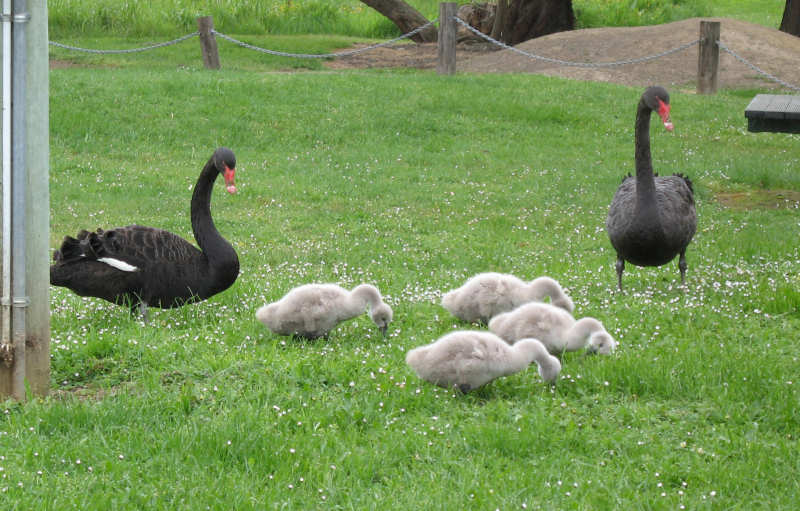 A family of black swans and their five cygnets entertained us for a while - delightful as they grazed on the lush grass of the picnic area. The adult birds never allowed their young to stray from them.