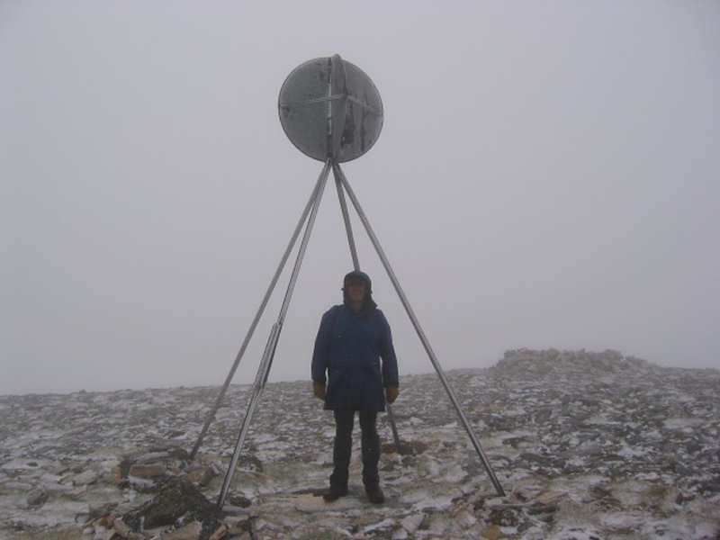 After our short detour - wasting about 10 minutes - we reached the top at about 8.50am but we could have been anywhere – no sign of anything except the barren top, each other, the trig point, and fields of snow. It was blowing very hard. We took a couple of photos and left the top after only 5 minutes. We could have walked to the edge of the cliff without ever knowing we were there (until the freefall). On the way down it started to hail and settle underfoot, making progress a bit more tentative. By the time we had got back to Tahune Hut it had turned to heavy rain. As we were climbing down Matthew wondered what the closed track would have been like. It seemed to go straight up a gully from the first steep ascent and would probably have cut off a lot of distance for Irenabyss walkers. This route is closed for rehabilitation. With the erosion from walkers this gully would turn into a creek and eventually a waterfall.