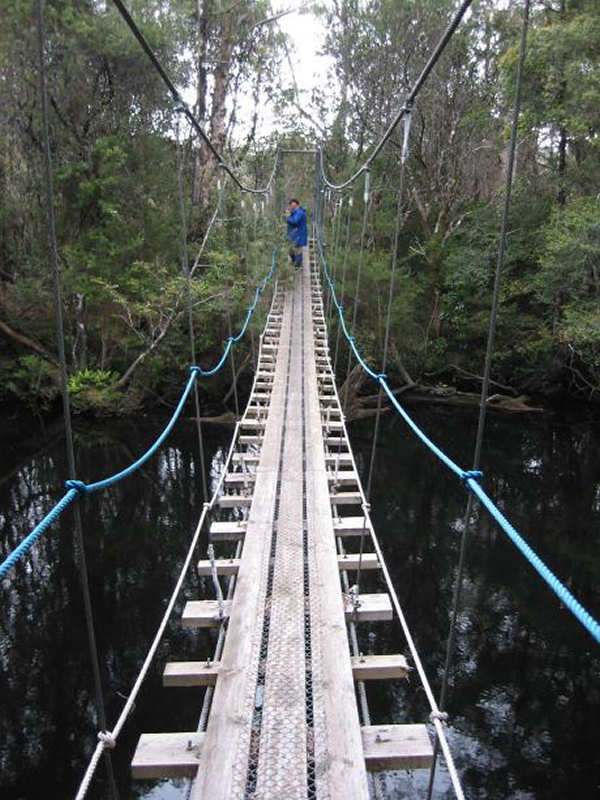 As we crossed the suspension bridge over the Loddon River we said "hello" to three 40-something (aged) men who were on Day 1 of their trip. One of them had a pack he said weighed 28kgs. (By comparison ours weighed about 19 – 20kgs each). I offered to help him out by taking some of his gear but he explained that he had 3 ice cream containers of vegetables with him and didn’t really want to leave anything. They looked horrified at the state of our gaiters and the mud up our thighs as they didn't have gaiters. We wished them the best of luck and plodded on.